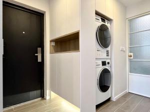 The apartment comprises two separate bedrooms complemented by one bathroom fitted with a walk-in shower and complimentary toiletries such as body soap, shampoo, conditioner and slippers for added comfort. A fully equipped kitchen includes a stovetop, refrigerator, electric kettle and kitchenware alongside essential appliances like a washing machine and tumble dryer to ensure convenience during your stay.